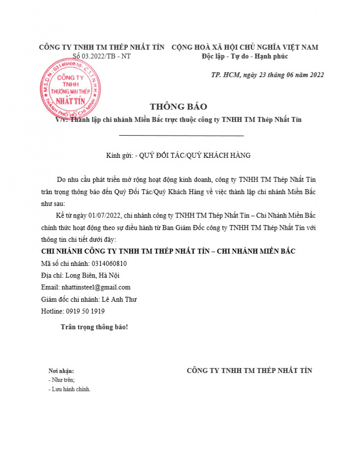 THÔNG BÁO V/V THÀNH LẬP CHI NHÁNH MIỀN BẮC TRỰC THUỘC CÔNG TY TNHH TM THÉP NHẤT TÍN